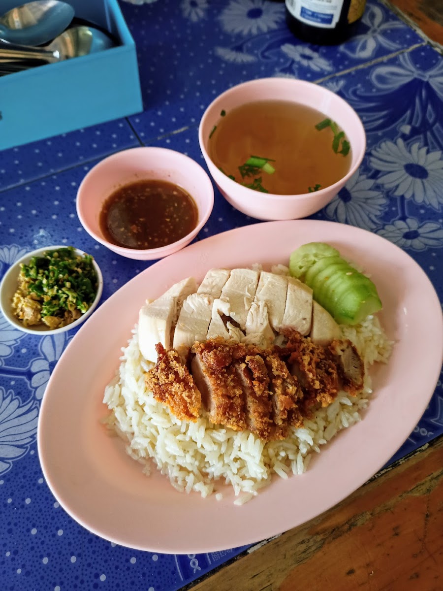 Pretty good chicken and rice. Boiled chicken was on point. Very moist as well as the flavorful rice. The sauce was nice as well. Not too tangy a bit on the sweet side. The soup was good as well with a rich chicken onion ginger flavor. Service was fast. Silverware was on the table. They had seating for about 25. Up there top 5 chicken and rice locations I have tried. Opens Early, good for breakfast. 50baht for the regular portion.
